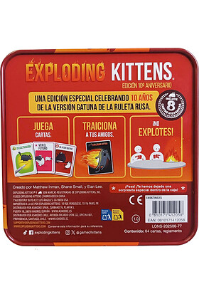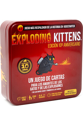 Una edición especial celebrando el 10º aniversario de Exploding Kittens. El juego es una versión gatuna de la ruleta rusa con un gran componente estratégico: los jugadores van robando cartas hasta que a alguien le sale un Exploding Kitten; cuando esto sucede, esa persona muere y queda eliminada de la partida, a menos que tenga una carta de Desactivación, que permite neutralizar al Exploding Kitten con armas como punteros láser, friegas de barriga o bocatas de menta gatuna. El resto de las cartas de la baraja sirven para cambiar de lugar, mitigar o evitar a los Exploding Kittens. Contenido: 64 cartas y 1 manual de reglas. Notas: caja metálica, incluye 8 cartas históricas y una sorpresita en el interior. Edad mínima recomendada: 7 años; duración: 15 minutos; número de jugadores: de 2 a 5.