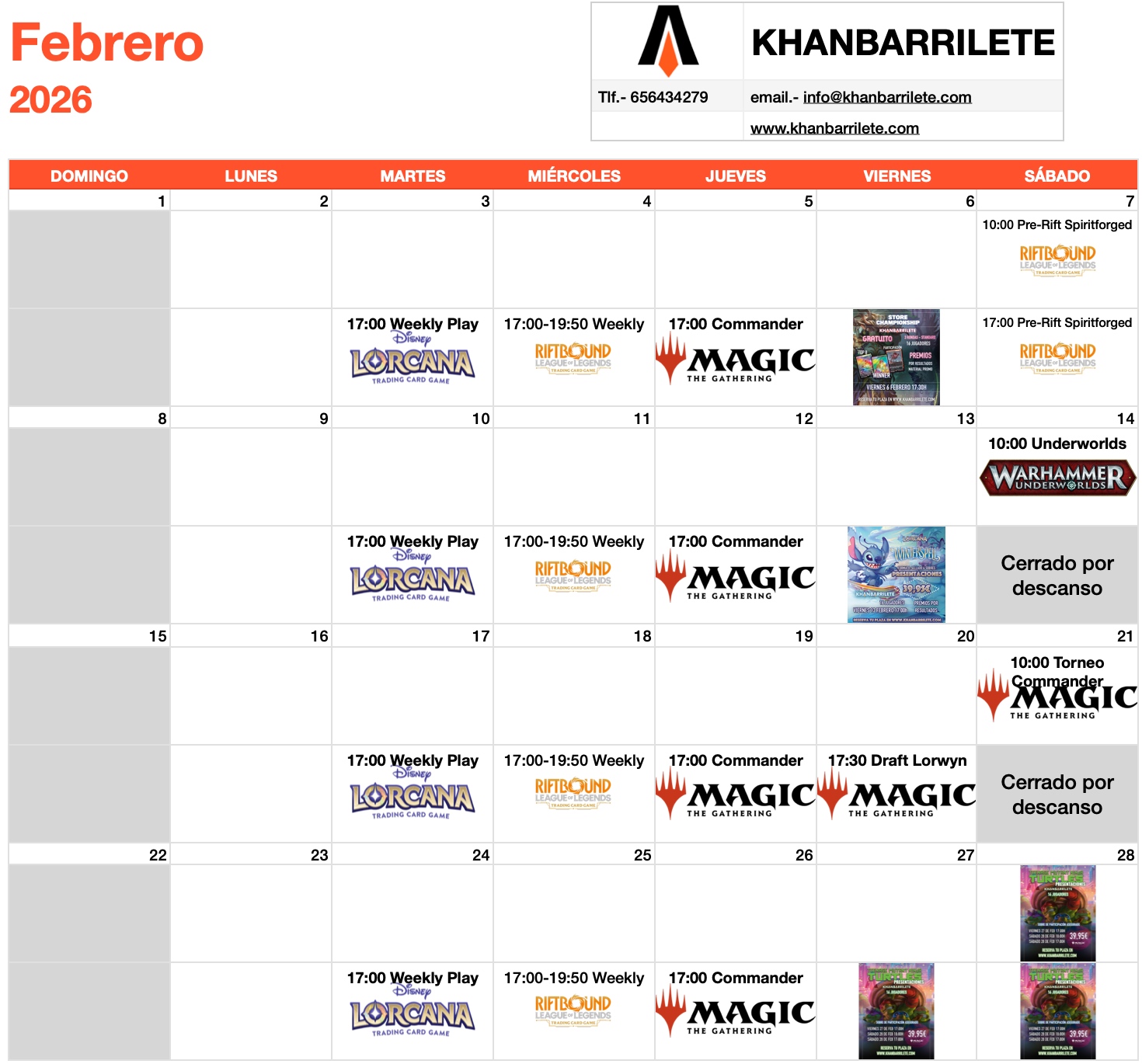 EVENTOS SEMANALES CONSTRUIDOS TCG's: Precio de inscripción 5,00 euros; 3 Rondas de suizo sin top de 45 minutos más 5 turnos o 5 minutos (lo que acabe antes) excepto los eventos de los Sábados, que serán 4 rondas (de 9 a 16 jugadores) de 50 minutos más 5 turnos o 5 minutos (lo que acabe antes), 55 minutos en el caso de Lorcana en Sábado; Premios: material promo dependiendo de su disponibilidad, y barriletes según recaudación por puntos para los resultados 4-0, 3-1, 3-0-1 y 2-2.