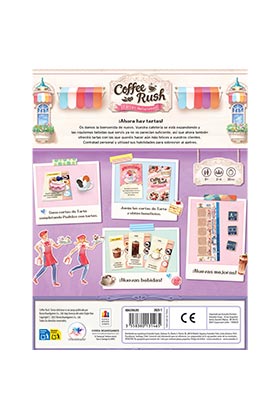 Ahora hay tartas! Os damos la bienvenida de nuevo. Vuestra cafetería se está expandiendo y las riquísimas bebidas que servís ya no os parecían suficiente, asa que ahora también ofrecéis tartas con las que queréis hacer aún más felices a vuestros clientes. Contratad personal y utilizad sus habilidades para sobrevivir al ajetreo. Gana cartas de Tarta completando Pedidos con tartas. Juega las cartas de Tarta y obtén beneficios. Nuevas bebidas! Nuevas mejoras! Contenido 4 tableros individuales, 12 fichas de mejora, 30 cartas de Pedido de la expansión, 60 cartas de Tarta, 32 tartas, 2 peones, 2 bandejas para ingredientes, 1 reglamento Nota Se necesita una caja básica de Coffee Rush para usar este producto.