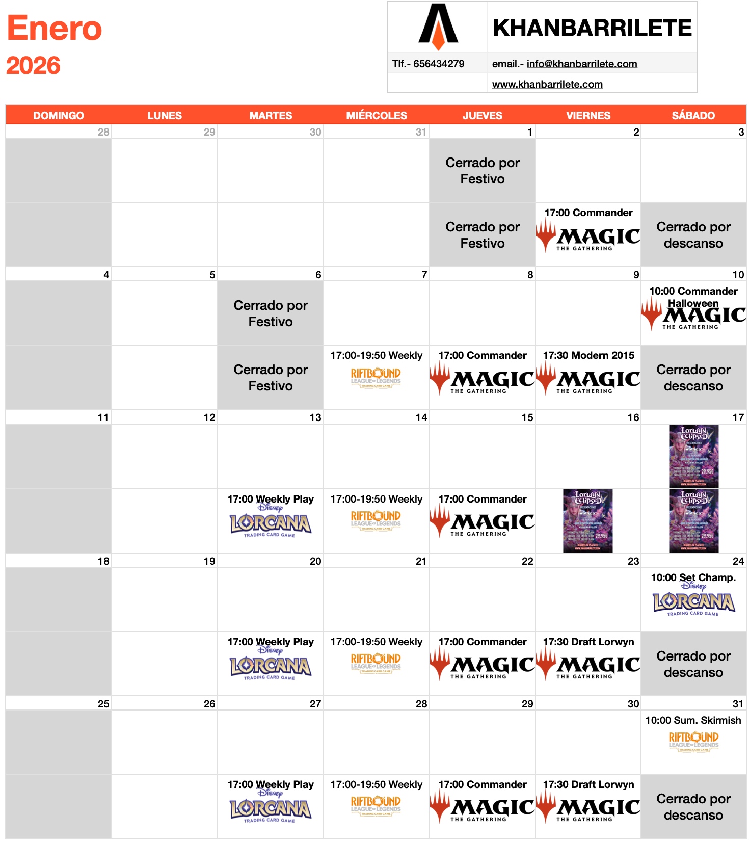 EVENTOS SEMANALES CONSTRUIDOS TCG's: Precio de inscripción 5,00 euros; 3 Rondas de suizo sin top de 45 minutos más 5 turnos o 5 minutos (lo que acabe antes) excepto los eventos de los Sábados, que serán 4 rondas (de 9 a 16 jugadores) de 50 minutos más 5 turnos o 5 minutos (lo que acabe antes), 55 minutos en el caso de Lorcana en Sábado; Premios: material promo dependiendo de su disponibilidad, y barriletes según recaudación por puntos para los resultados 4-0, 3-1, 3-0-1 y 2-2.